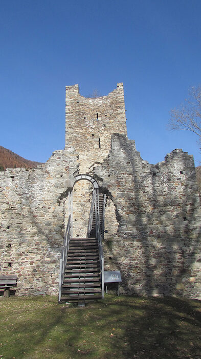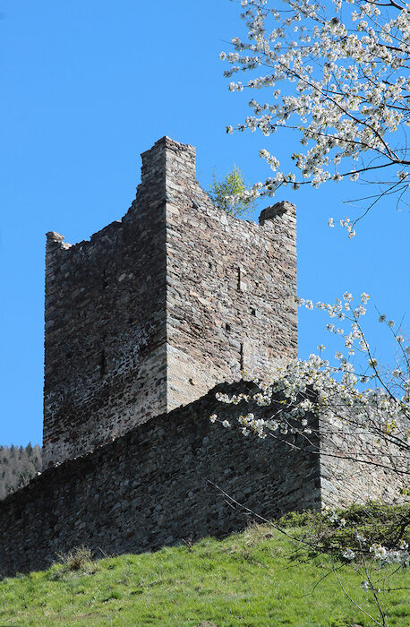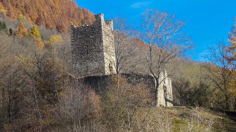 La nostra gita prende le mosse da Sondrio da dove, con l'auto, si deve imboccare la strada panoramica che conduce a Colda e a Montagna. La strada parte subito in salita lasciando il centro abitato per lambire poco dopo, sulla destra, il convento dei Frati Cappuccini di Colda. Più avanti superato il Castello Grumello le cui mura si stagliano sul poggio che delimita a destra l'orizzonte vicino, si giunge ad un bivio (semaforo). Qui si deve volgere a sinistra per imboccare la strada che, con alcuni tornanti, sale entrando nel paese di Montagna in Valtellina. Poco dopo compaiono i primi cartelli indicatori per Carnale e S. Maria. Tralasciando la deviazione per quest'ultima località si prenda la strada per Carnale. Poco dopo, abbandonata l'ultima contrada di Montagna, Cà Paini, 622 m, la strada si stringe proseguendo comunque asfaltata. Si sale fra tratti da poco rimboschiti a causa dell'abbandono della campagna, fra frutteti e prati ancora ben tenuti, fino a raggiungere il grappolo di antiche case di Cà Bongiascia indicato da una grande scritta su un muro di cemento. Lasciata l'auto si sfila lungo la stradicciola che corre a valle delle case per portarsi al limite orientale del nucleo. Si devia a sinistra e poco dopo una fontana ecco il cartello della C. M. di Sondrio che indica la partenza dell'itinerario che avrà, come prima meta, il Castello di Mancapane. Una facile sentiero, quasi uno spalto inerbito, si inoltra pianeggiante in una valletta; lasciata a sinistra una allettante diramazione proseguiamo oltre per traversare il ruscello che solca l'avvallamento tramite un ponticello di legno. Ancora in piano usciamo sul versante opposto passando al margine inferiore del poggio erboso su cui, già visibili, sorgono le mura del Castello di Mancapane. Raggiunto un altro cartello indicatore stacchiamoci momentaneamente dal sentiero principale salendo a sinistra lungo un bel tracciato che in breve porta sul prato antistante il fortilizio. Qui una elegante bacheca espone un cartellone esplicativo in cui sono narrate le caratteristiche del monumento.