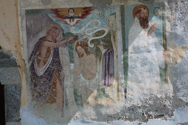 Superata la chiesa, seguiamo ora la strada asfaltata che sale lambendo baite e casette per la villeggiatura. Al primo tornante si trascura una deviazione a destra e lo stesso facciamo anche poco dopo il successivo, lasciando a destra la deviazione per Oniscio e per l'Alpe Mara, proseguendo invece a sinistra, lungo una carrozzabile. Il percorso ci riporta ad attraversare il Davaglione; facendo attenzione, in alto, fra gli abeti si scorge la sagoma di una tozza piramide di terra. Traversato il torrente la strada esce dalla Valle del Davaglione portandosi a monte della chiesa e dell'abitato di S. Giovanni 1002 m. Lasciata a destra la deviazione che porta al maggengo di Carnale 1250 m (fontana), si scende a sinistra lambendo il piccolo e antico nucleo con la sua chiesa. Il complesso merita una visita anche se molte delle abitazioni sono in stato di completo abbandono; le antiche case si stringono attorno alla grande costruzione della chiesa, risalente al XV secolo, dalla facciata abbellita da un affresco cinquecentesco di autore ignoto raffigurante "il battesimo di Cristo".