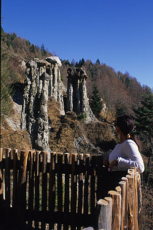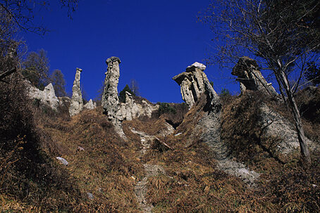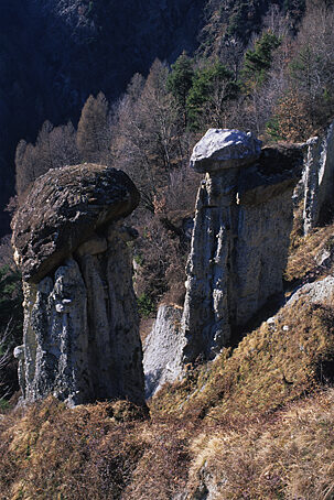 Fra le molteplici e spesso bizzarre meraviglie che la natura offre ai nostri occhi, una delle più curiose è quella dei calanchi di terra, pinnacoli e creste terrose formati dall'erosione delle porzioni più tenere di antichi terreni morenici. Tali formazioni si situano, comunemente, su ripidi versanti di valli e vallette, e dove si trovano aree di terreno facilmente erodibile. La ripidezza del versante accresce l'azione turbinosa delle acque meteoriche aumentandone la forza e, quindi, la capacità erosiva. Accanto all'azione delle acque, pioggia e ruscelli conseguenti, dobbiamo anche ricordare quella degli altri agenti atmosferici. Periodi di siccità, ma anche l'azione del gelo e del disgelo, screpolano il terreno rendendolo più fragile e agevolando l'azione del vento. In queste aree si formano dapprima delle vallecole che man mano si approfondiscono formando ripidissimi e sottili crinali di terra e ghiaia compatte. Allorché l'opera delle acque si manifesta anche sulle pareti di questi crinali ecco il formarsi di torri e guglie costituite dalle porzioni più compatte del terreno. Queste fragili strutture geologiche hanno una loro particolare variante quando nel terreno si trovano anche grosse pietre. In questo caso capita, spesso, che il pietrone eserciti una azione protettiva della porzione inferiore di terra che viene man mano isolata dall'erosione, in modo da potere emergere sempre più evidente sul pendio, come una sorta di torre o guglia sormontata da un cappello".