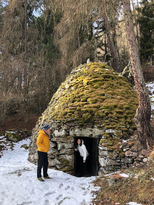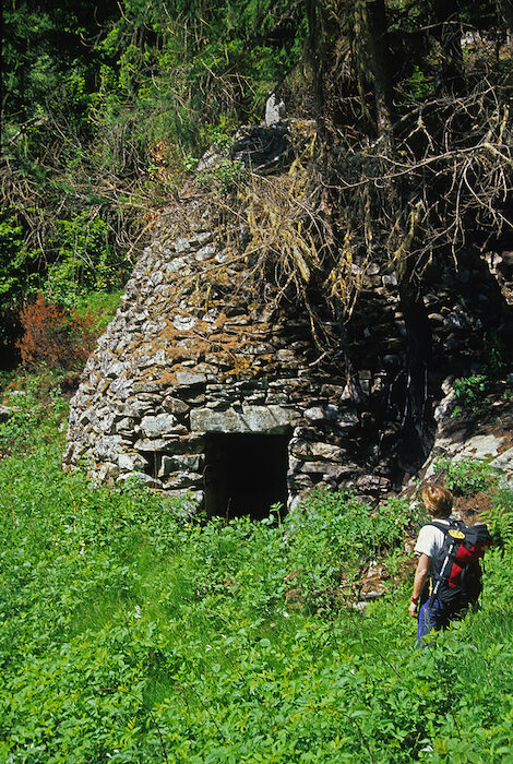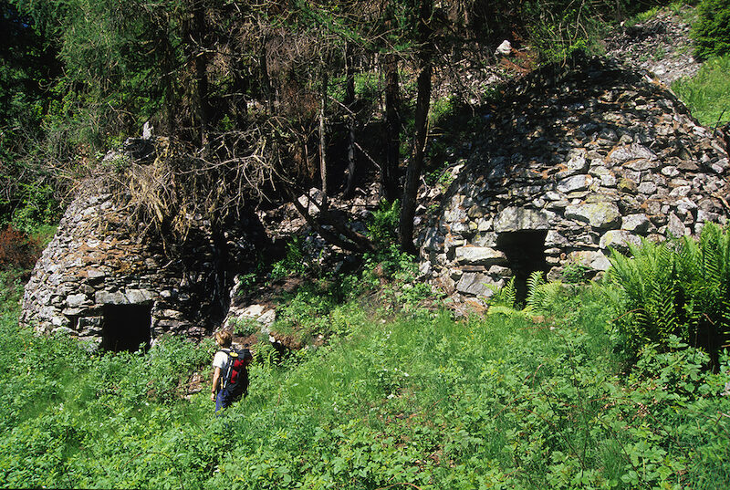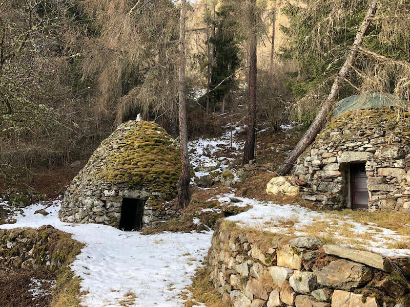 Nei pressi della caserma sorgono alcune baite; a monte di esse prosegue una mulattiera che lambisce un vecchio rudere e, alle sue spalle, quindi a pochi minuti di cammino dalla caserma, si trovano le due arcaiche costruzioni di pietra che abbiamo sopra descritto.