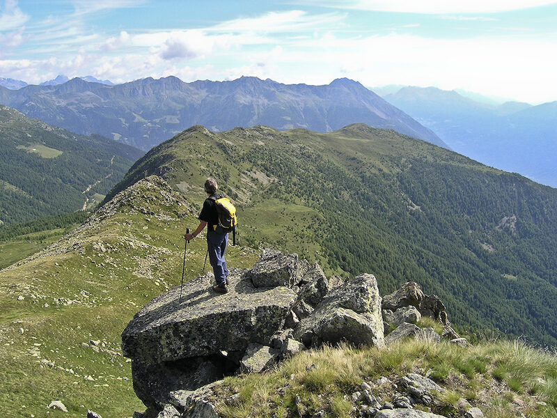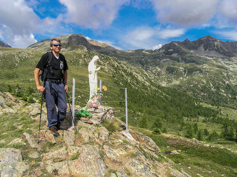 Non occorre molto cammino per sbucare presso il ridente alpeggio di Frontalone, a 1831 m, località adatta per riposarsi un attimo al cospetto di un panorama estesissimo sulla Valtellina. La mulattiera che stiamo percorrendo non è che una delle tante opere di difesa costruite durante la Grande Guerra in previsione di uno sfondamento delle linee italiane sul fronte dello Stelvio. Il percorso è ancora perfettamente conservato e, se si pensa che partiva da fondovalle, non si può che restare ammirati dalla perizia con cui fu realizzata.