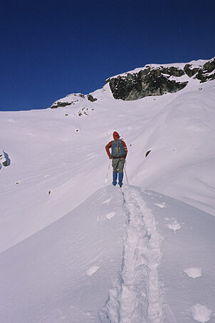 B) Qesto percosro non è segnato nella cartina dettagliata. Dal parcheggio della stazione degli impianti di risalita di San Guseppe 1433 m si segue la strada per il rifugi Barchi e Lago Palù. Dopo una prima serie di tornanti si lascia l'itinerario principale per deviare a sinistra su una pista generalmente battuta dalle motoslitte che dopo essersi abbassata punta verso Nord-ovest, attenendosi alla strada che porta all'Alpe Entova e al Rifugio Longoni. Raggiunta l'Alpe Entova 1917 m, si abbandona il tracciato per piegare a destra, risalendo il largo vallone dell'Entovasco per tagliare così la lunga serie di tornanti della strada. Tenendo preferibilmente la sponda sinistra orografica si rimette piede sulla strada verso i 2400 m e la si percorre verso destra fino al suo termine (il tratto finale si svolge su pendii ripidissimi ed è ormai caduto in rovina). Si sbuca così nell'ampia conca ove si trova la baracca della teleferica che serviva il rifugio Entova-Scerscen, ben visibile sulla cresta sovrastante. Volgendo a destra si percorre la conca e i successivi gobboni che in lenta salita permettono di raggiungere la Forcella d'Entova 2831 m. Da qui si punta a Sud verso la quota 2882 m e tagliando a sinistra poco sotto il suo vetta, ci si abbassa leggermente per raggiungere la base dell'evidente canale che raggiunge la cresta sommitale del Sasso Nero a sinistra del salto roccioso di quota 2905 m. Lasciati gli sci si supera il canale (100 m c.; qualche passo su roccia e misto fino al III) e si raggiunge la dorsale che si percorre a sinistra fino alla vicina vetta (ore 1 dalla Forcella d'Entova).