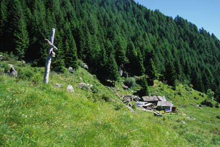 Risaliamo questo settore sconvolto più che dalla frana dai successivi lavori di sistemazione che hanno coinvolto anche il versante su cui camminiamo. Qua e là lungo il percorso notiamo punti di misurazione destinati a valutare eventuali nuovi spostamenti della massa franosa. Oltre la zona detritica raggiungiamo un bel nucleo di baite perfettamente inserito fra i grandi blocchi di pietra che lo circondano. Una serie di tornantini attacca ora una dorsale secondaria facendoci prendere quota fino a sbucare su un panoramico e aperto poggio erboso. Il sentiero tira dritto nel prato ombreggiato da poche piante e punta al vicino grappolo di case dell'Alpe Son. L'abitato sorge con le case fittamente addossate, separate da stretti vicoli e da quasi l'impressione di una piccola fortezza. Ad accentuare questa sensazione è la casa più a valle che presenta una facciata tondeggiante sul cui muro a secco sono state inserite grosse pietre di bianca quarzite quasi a segnalare l'importanza dell'edificio e a diversificarlo da quelli vicini. Una fresca fontana concede refrigerio; poi si riprende lambendo le case e uscendo dal nucleo. Poco dopo, superato un recinto di pietre, si trova una biforcazione. A sinistra si procede verso Pra Piasci e il Rifugio Cometti, a destra si continua verso la Bosio. In questo tratto il sentiero si perde un po' fra i prati, ma è sempre visibile. Ci si tiene una ventina di metri a valle del crocifisso che sorge a monte di Son, si traversa una zona di cespugli infestanti e spinosi e si giunge ad una pianta sul cui tronco si trova un cartello indicatore. Ci troviamo una trentina di metri più in basso di tre baite con fontana. Procediamo ancora diritti lungo la traccia fra prato e cespugli finché, improvvisamente ci immettiamo su una sorta di tratturo nato quasi dal nulla. Si sale faticosamente arrivando ad un casello per la presa dell'acqua dove sembra di perdere la traccia. Invece il tratturo riprende a sinistra del manufatto e, con lunga, faticosa diagonale senza tornanti, arriva al margine dei prati dell'Alpe Acquabianca. Giunti presso le prime baite si sale verso destra rimontando il pascolo per giungere in vista di due grandi croci lignee. La prima si trova su un grosso masso che si lambisce a valle per aggirarlo sulla sinistra; sempre fra l'erba si rimonta una traccia in parte occupata da un ruscelletto e, dopo una breve salita, si devia a sinistra rientrando nel bosco. Ora il sentiero ritorna a farsi marcato e, dopo un altro lungo diagonale, riprende a salire a zig zag nel bosco intervallato da qualche radura. Si prende ora un saneiro che sale verso destra e dopo un ventinaio di metri di dislivello interceta una sterrata proveniente dall'Alpe Lago
