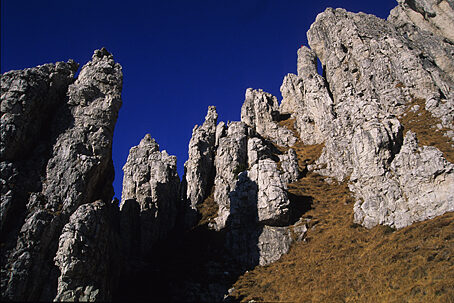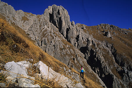 Lasciata l'auto si percorre la carrozzabile che, in pochi minuti di cammino, adduce al Rifugio Porta. Da qui si imbocca il sentiero che s'inoltra nell'abetaia del "bosco Giulia" alle spalle del rifugio (segnavia n. 7). Dopo poche decine di metri si giunge di fronte ad un'immagine sacra; il sentiero la aggira sulla destra e, poi, si porta a monte di essa per proseguire con alcuni tornanti nella faggeta. Un'ultima diagonale verso sinistra porta in un valloncello detritico dove si trova un altro segnavia. Si segue il tracciato che inizia, ora, a salire ripido sulla pendice sempre più scabra della montagna. Dopo alcuni tornanti si traversa una roccetta, facilitati da una catena, e si continua con numerosi tornanti guadagnando rapidamente quota.