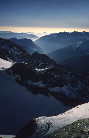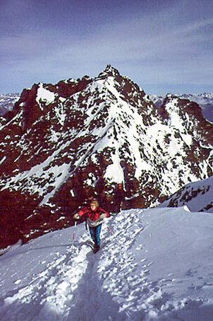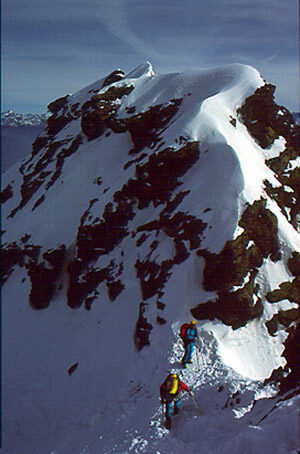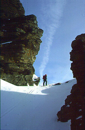 Secondo giorno. Dalla Capanna Mambretti 2003 m i pendii immediatamente successivi sono un po' lo spauracchio di molti sci alpinisti. In realtà, essendo ripidi e ben esposti al sole, sono sì un pericolo potenziale in caso di nuove nevicate, forte rialzo termico o apprezzabili accumuli eolici, ma sono anche soggetti a un veloce assestamento, tanto che quasi sempre la neve vi si trova trasformata e portante. Si dovrà avere, piuttosto, l'accortezza di riattraversarli al ritorno in un orario non troppo avanzato.
