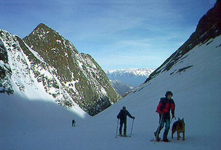 Si attraversano, in salita modesta ma con un impegnativo mezza costa, questi ripidi pendii che, verso E, portano ad una piccola conca del fondovalle, avvicinandosi alla quale si individua sulla destra il vallone di Scais, invisibile dalla Mambretti. Volgendo, quindi, leggermente a destra (SE) si imbocca l'ampio vallone, seguendolo senza possibilità di errore. Accompagnati da uno scenario suggestivo fatto di dolci pendii innevati che si contrappongono a vette slanciate e compatte pareti rocciose, ci si porta ai piedi dell'unico cambio di pendenza notevole, la cosiddetta 'schiena di mulo'. D'estate, questo gobbone presenta alcuni crepacci, d'inverno generalmente coperti da un consistente strato di neve; date comunque un'occhiata d'insieme. A monte della piccola impennata, superata leggermente sulla destra con alcuni dietro-front, si punta verso E all'evidente intaglio roccioso noto come Bocchetta di Scais 2905 m. Prima di raggiungere l'insellatura si individua facilmente un ripido canalino alla sua destra e, lasciati gli sci alla base di quest'ultimo, lo si risale (utile una piccozza) fino ad incrociare la cresta settentrionale. Dopo aver superato alcune facili roccette, si prosegue per pendii di neve fino alla vetta del Pizzo Redorta 3038 m (3 ore).