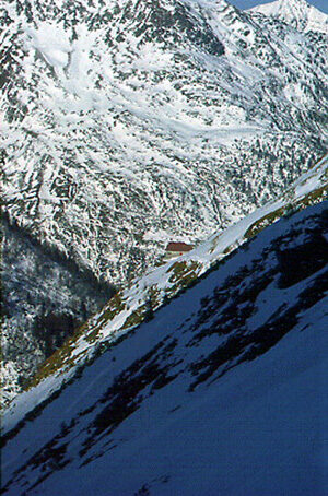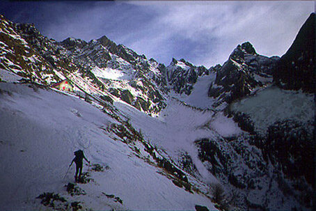 Primo giorno. Dalla Centrale Vedello 1032 m si prosegue inequivocabilmente lungo la sterrata per Agneda e, tralasciata la deviazione per Ambria, in poco più di un chilometro e alcuni tornanti si raggiunge la chiesina di Agneda 1228 m, paese un tempo abitato tutto l'anno. Segue un tratto assolutamente pianeggiante, che termina in prossimità di un cartello di divieto d'accesso (fin qui, quindi, in condizioni di scarso innevamento si può salire in auto). Poco oltre, un grande conoide di valanga costringe quasi sempre ad un modesto scavalcamento, oltre il quale la carrareccia prende bruscamente a salire con numerosi tornanti tra gli abeti. Con un curvone verso destra si giunge in vista della grande Diga di Scais, in prossimità del Punt de la Padèla, così chiamato, forse, per le marmitte dei giganti che si possono in parte ammirare sul greto del torrente. Seguendo le indicazioni per la Capanna Mambretti, quindi, si imbocca a sinistra il ponticello, per proseguire lungo una mulattiera nel bosco. Per la verità questo tratto, sotto le chiome frondose degli abeti, spesso scarseggia di neve e forse Vi farà un poco faticare. ConsolateVi pensando che è piuttosto breve e che, al suo termine, avrete raggiunto il livello dello sbarramento artificiale. Verso destra la traccia porta, infatti, alla casa dei guardiani della Diga di Scais 1503 m, località nel cuore delle montagne dove si percepisce un vivo senso di solitudine. Non stupiteVi, dunque, se uno dei due guardiani che si trovano fissi qui vi fermerà per chiederVi dove state andando o semplicemente per parlare del più e del meno. Si prosegue costeggiando il Lago di Scais per riprendere la salita in prossimità delle Case di Scais 1547 m. Oltrepassate le radure tra le quali si trova l'ex Rifugio Guicciardi, riconoscibile per le decorazioni sotto le falde del tetto, si superano alcuni passaggi obbligati nel bosco, tra grandi roccioni (in discesa se ne vedranno delle belle). Il bosco termina in vista dell'ampia Alpe Caronno 1612 m, dove si comincia a respirare aria di alta montagna. Restando a sinistra delle baite si attraversa il pianoro puntando ad una valletta ingombra di ontani e piccoli pini contorti, segno inequivocabile che la zona è percorsa, di tanto in tanto, dalle valanghe. La traccia, quindi, percorsa la parte inferiore della valletta, in caso di consistenti accumuli dovrà tenersi sul piccolo crinale a destra della conca (sinistra orografica), tra le grosse conifere. Oltrepassato il limite del bosco, sempre lungo il crinale, si superano alcuni brevi dossi fino alla Capanna Mambretti 2003 m (3.30 ore).
