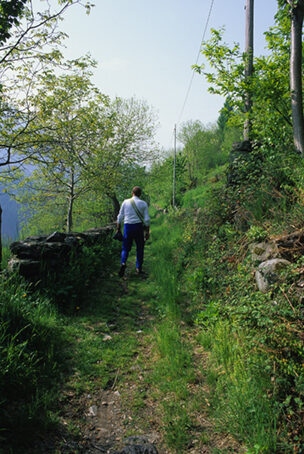 L' itinerario si stacca verso sinistra all' inizio della carrozzabile della Val Gerola. Una stradina asfaltata inizia a salire a tornanti nel bosco alle spalle di Morbegno. Poco più avanti il percorso lambisce le rovine della chiesa di S. Carlo. Interessante è il bel portale trilitico che incornicia la soglia di una casa poco sopra la chiesa. Riprendendo il cammino, poco dopo si incrocia un sentiero che sale da sinistra (variante che parte dal piazzale del Centro Sportivo, presso il Museo e la Biblioteca di Morbegno, e che, passando davanti alla Piscina e al Museo, imbocca a sinistra il Vicolo Cotta che, poco dopo, raggiunge l' antico ponte allo sbocco della forra della Valle del Bitto. Prima del ponte, si entra a destra, nel Vicolo Nani, che sale ripido costeggiando la forra fra alti muri raggiungendo la stradina che sale a Sacco).