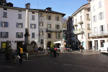 Mentre, a poco a poco, ci si dirige verso Piazza Pestalozzi, si può cominciare a respirare un'atmosfera decisamente mitteleuropea tipica di una cittadina situata al confine con la Confederazione elvetica. Tra i volti che popolano la via, assieme a quelle dei cittadini chiavennaschi, si riconoscono i lineamenti di turisti germanici che si mescolano a quelli di semplici sbadati visitatori d'oltre confine. Questa forte presenza di stranieri, non può che rafforzare la nostra convinzione del valore artistico e culturale che questa piccola cittadina riveste soprattutto nei confronti di un turismo esigente qual è quello straniero. Distratti da queste, forse banali, considerazioni, tra le vetrine e i portoni di caseggiati che hanno visto almeno quattro secoli della nostra storia, arriviamo in prossimità della piazza.