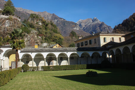Sul lato opposto di Piazza Pestalozzi si apre la Via Lena Perpenti. Lasciamo il fastoso palazzo alle nostre spalle, per dedicargli attenzione più tardi, e cominciamo a salire per l'angusta via in direzione dell'altrettanto importante Palazzo Pollavini, oggi "Istituto dell'Immacolata". L'austera facciata del palazzo dell'ordine monastico si contrappone alla singolare corte medioevale detta degli Asini, in dialetto "la curt di àsen". Con uno sguardo quasi furtivo, ci si perde facilmente nei particolari architettonici delle balconate lignee che dominano la corte. Una caratteristica colonna tornita in pietra ollare sorregge i poggioli: si tratta di un dettaglio architettonico abbastanza unico nel suo genere che, tuttavia, contraddistinse diverse costruzioni antiche della zona.Torniamo alla piazza, che nel dialetto locale viene denominata Canton, e al suo palazzo che merita una visita più attenta, in particolare al suo interno, dove si trova un magnifico salone affrescato e una preziosa stüa seicentesca.