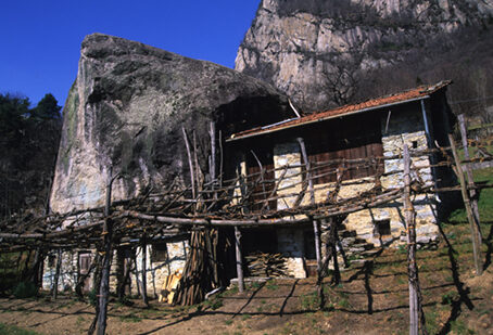 Stiamo percorrendo gli antichissimi depositi morenici lasciati dal ritiro dei grandi ghiacciai del Quaternario. In alto, al loro termine, è nettissimo lo stacco con le soprastanti, aspre rupi granitiche i cui enormi frammenti franati in epoche remote emergono dalle vigne. Dopo circa 3 km eccoci a Pianazzola dove lasciamo l'auto. Al termine della strada è facile notare, sulla sinistra, il piccolo cartello escursionistico che indica la partenza del sentiero: inizia la lunga gradinata. La ripidezza del pendio e l'immediato substrato roccioso rivestito, qui, da una selva di castagni, hanno determinato scelta e impostazione del tracciato. Non si poteva giocare con comodi e frequenti tornanti, ma bisognava comunque trovare il modo di "inventare" una salita che fosse la meno faticosa possibile. L'unica alternativa era quella di creare una gradinata che, con poche curve, permettesse di guadagnare presto quota consentendo, al tempo stesso, un passo sicuro. Così, seguendo questo piccolo capolavoro di edilizia alpina eccoci alle prese con rampe e rampette di scalini in granito, intervallate ogni tanto da qualche breve diagonale che consente di riprendere un po' di fiato. In un paio di tratti i costruttori hanno sfruttato abilmente alcune emergenze rocciose disponendo una scalinata elicoidale di notevole effetto. Il percorso si svolge a destra della grande rupe granitica decritta nella presentazione e tenete bene a mente che dovremo raggiungerne la sommità. Quindi procederemo lungamente (e faticosamente) finché una serie di successivi tratti a mezza costa, verso sinistra, ci riporterà gradualmente verso i roccioni, qui quasi del tutto celati dal bosco. L'ultima parte dell'itinerario lambisce una bella fontanella ricavata da una sorgente, vero e proprio ristoro dopo tanta fatica. Si continua, poi, sempre con lento diagonale, lungo il camminamento che in questo punto è reso più sicuro da una ringhiera protettiva. Infine, il sentiero sembra infilarsi in una sorta di passaggio obbligato, quasi un piccolo valico, la cui sinistra è marcata dalla cima delle rupi granitiche. Dopo questo passo ecco aprirsi l'incantevole terrazzo erboso di Dalò. Il villaggio non è ancora visibile e, prima di arrivarci, consigliamo di deviare a sinistra per spingersi lungo il prato, fino alla croce che segna il culmine delle rocce. La croce metallica, eretta nel 1981, sostituisce quella di legno che fu infissa nel 1704 e che resistette alle intemperie per quasi trecento anni. Da quassù il panorama è veramente mozzafiato. Di fronte si staglia l'oscura parete settentrionale del Pizzo di Prata che manda verso Est una dentellata serie di vette minori, formanti lo spartiacque fra la Bregaglia e la Val Codera. Sempre di fronte, poco sopra Chiavenna, distesa letteralmente ai nostri piedi, ecco il poggio su cui sorge l'antico abitato di Uschione. Verso Est s'allunga il solco della Val Bregaglia, coronato in fondo dalle granitiche vette del Pizzo Badile e delle Sciore. A Sud lo sguardo spazia sulla vasta piana di Chiavenna, a Ovest appaiono le cime della Mesolcina e verso Nord s'inoltra la Val San Giacomo sul cui versante destro orografico scorgiamo i minuscoli abitati di Olmo e San Bernardo, sovrastati dalle aguzze punte della Cima Camoscie.
