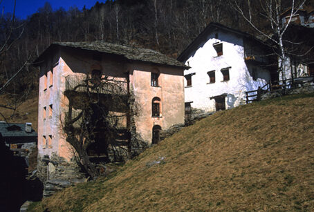 Tornati sul sentiero, in pochi passi s'inizia la breve discesa che porta nel villaggio, la cui visita ci occuperà per qualche minuto. Vi consigliamo di iniziare dalla chiesa, piccola ma molto aggraziata e perfettamente inserita nell'ambiente circostante. L'edificio, dedicato a S. Michele, fu costruito nel 1657. Successivamente, nel 1735-36, fu aggiunta la cappella laterale mentre il campanile è più tardo, del 1816. Per quanto possa apparire strano, all'interno della chiesa è conservato un piccolo capolavoro di G. B. Macolino il vecchio, raffigurante San Michele che sconfigge il drago. Graziosissimo anche il piccolo cimitero annesso. Dalla chiesa si volge verso le case disposte principalmente su due file, ai lati del sentiero principale. Molte sono in via di ristrutturazione e alcune mostrano chiarissimi segni dell'antico influsso di popolazioni d'origine Walser che, nella loro migrazione transalpina, si spinsero fin qui dopo aver valicato lo Spluga. Poco sopra la chiesa si scorge una costruzione che spicca per le sue caratteristiche architettoniche particolari. Si tratta, senza dubbio, della dimora di un importante membro della comunità, che ricorda, in tono minore, l'architettura delle tipiche case patrizie medioevali della Valchiavenna.