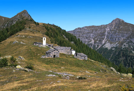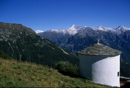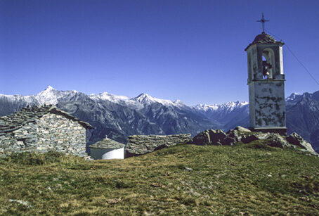 Adagiata in fondo alla grande spalla di una dorsale, al limite fra il bosco e i pascoli d'alta quota, sospesa fra due valli e affacciata su un panorama estesissimo, l'Alpe Cima è una di queste località. Per chiunque sarà una sorpresa raggiungere questo piccolo gruppo di baite: da tempo abbiamo abbandonato la strada e le mulattiere più in basso, da tempo ci siamo allontanati dai maggiori alpeggi. Una ripida salita e un sentierino che serpeggia fra roccioni, ci hanno portato nel cuore dell'alta montagna, all'Alpe Cima dove non ci aspetteremmo certo di trovare, fra le poche case di pietra, un piccolo campanile che spicca bianco fra i pascoli e una chiesuola rotonda che s'affaccia sulla Val Chiavenna e la Val Bregaglia. Campanile e chiesa sorgono stranamente staccati l'uno dall'altra; forse la torre è stata collocata in posizione più esposta per renderla meglio visibile: ma perché non farci vicino anche la chiesa visto che spazio ce ne sarebbe stato?