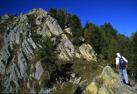 L'impegnativa ginnastica" prosegue fino ad una lieve insellatura dove il sentiero serpeggia su una banale cresta di erbe e roccioni per poi affrontare l'ultimo strappo, segnato in alto da bianchi scheletri di larici rinsecchiti.