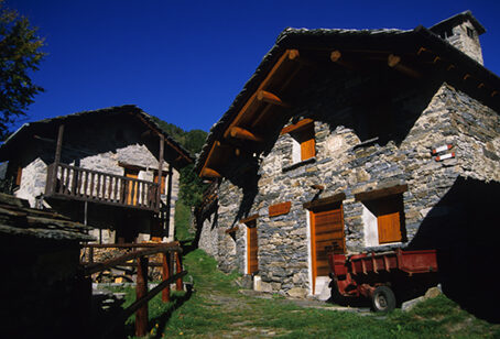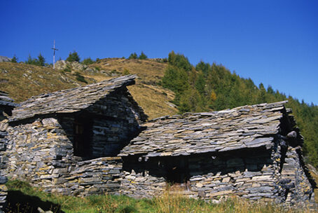 Lasciata l'auto s'imbocca la bella mulattiera lastricata che sale a destra della strada, in prossimità di una fontanella (cartelli indicatori). Con piacevolissima camminata la si percorre per una serie di tornanti che, nel bosco, lambiscono due successivi gruppi di baite abbandonate. Più in alto il selciato taglia la strada che porta all'Alpe Orlo e, infine, giunge al margine inferiore di questo splendido agglomerato. Le baite, distribuite in due nuclei, sorgono su una magnifica spalla boscosa in posizione assai panoramica.