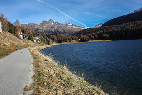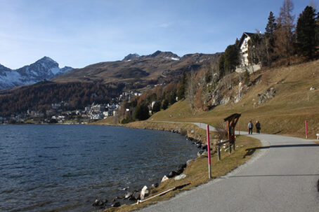 La conca di St. Moritz consente di effettuare bellissime passeggiate, soprattutto intorno al suo celebrato lago. A pochi passi dall'affollato centro engadinese, infatti, si possono percorrere numerosi sentieri e carrarecce dove ritrovare la tranquillità e il contatto con una natura selvaggia e poco contaminata dall'uomo. Ma i dintorni di St. Moritz sono anche la dimostrazione di come le attività turistiche ed economiche dell'uomo possano coesistere in armonia con l'ambiente. Il vasto complesso di tracciati, dei quali - con la presente descrizione - non si offre che un piccolo spunto, può essere percorso a piedi, facendo jogging, a cavallo, in mountain bike e, nella stagione invernale, con gli sci da fondo o su una slitta trainata dai cavalli. L'escursione che proponiamo può essere completata con una visita alle terme, oppure ai lussuosi negozi del centro o al museo dell'Engadina. I più attivi avranno l'imbarazzo della scelta se vorranno praticare uno dei numerosissimi sport, tradizionali e non, offerti da St. Moritz.
