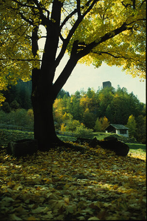 Da Bondo conviene tornare ad imboccare il vecchio tratto della carrozzabile di Val Bregaglia, recentemente abbandonato in favore della moderna circonvallazione che evita i nuclei di Spino e di Promontogno. Lasciamo a sinistra la salita per Soglio e superiamo le "quattro case" di Spino per poi lambire la gotica costruzione dell'Hotel Bregaglia, dominata dalla lama granitica del Pizzo Badile. Poco oltre si entra in Promontogno e, quindi, si attraversa la chiusa naturale mediante una vecchia galleria che ci porta "Ob-Porta", nella parte superiore della Bregaglia. Poco oltre la galleria, la strada compie una curva verso destra; alla successiva, s'incontra la stradicciola che, a gomito, sale a destra verso la sommità della chiusa naturale, méta di questa tappa. Lasciata l'auto si percorre la stradina che in leggera salita ci porta sul sagrato della chiesa della Nossa Donna. L'edifico sacro ha antichissime origini: nominato per la prima volta nel 988, crollò nel XVI secolo per essere poi ricostruito dal nobiluomo bregagliotto Giovanni de Castelmur fra il 1845 ed il 1850. Della costruzione originaria resta visibile solo il campanile. L'importante posizione strategica del luogo è sottolineata dalla presenza dei ruderi di antiche fortificazioni di cui restano ben visibili un tratto di mura e una torre risalenti al XII-XIII secolo. Le fortificazioni furono ordinate dal vescovo di Como, allora in conflitto con quello di Coira. Sotto i ruderi del castello si trova la Müraia, postazione fortificata romana.