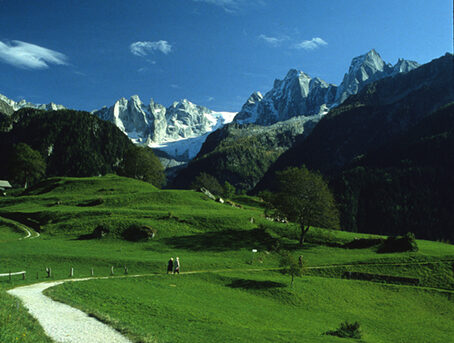 Una volta raggiunta la piazza principale, consigliamo di volgere dapprima a sinistra uscendo verso la periferia occidentale del villaggio. Si attraversano magnifici prati ben curati lambendo le caratteristiche costruzioni rurali del luogo mentre Soglio appare contro lo sfondo scuro del versante opposto della Bregaglia, coronato dalle vette della Bondasca. Tornati sui nostri passi attraversiamo le case per portarci ad oriente seguendo una strada sterrata che esce sul magnifico terrazzo panoramico affacciato sulla Bregaglia. Il panorama è costantemente dominato dalle grandi architetture granitiche del Pizzo Badile, del Pizzo Cengalo e delle Sciore che attirano irresistibilmente lo sguardo in direzione Sud-est. È un colpo d'occhio fra i più grandiosi delle Alpi (vedi itinerario "Al cospetto delle grandi pareti").