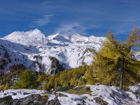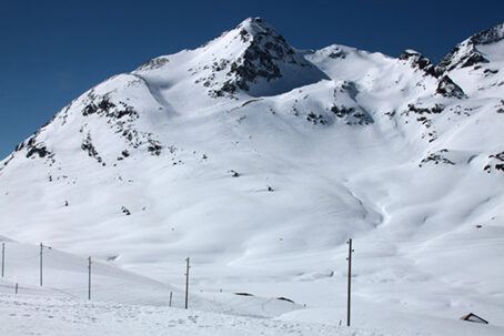 per la via di salita, oppure a Cavaglia lungo la Val da Pila. Scesi a quota 2400 m c. con un lungo diagonale verso SE portarsi al muro della diga e proseguire fino a Mott all'uscita della Galleria Lunga. Ora, con direzione E, scendere un breve e ripido bosco di larici sino in Val da Pila, dove con percorso obbligato si arriva a Cavaglia e col trenino si ritorna al Passo Bernina.