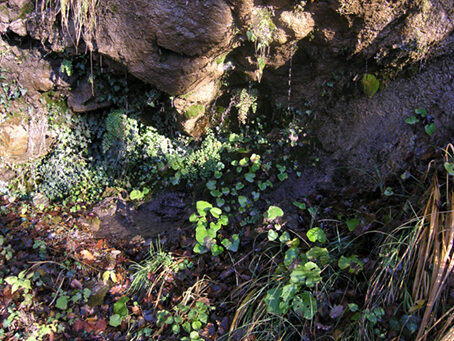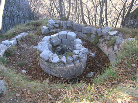 Facendo attenzione (segnali inesistenti) ci si abbassa infine di qualche metro sul versante meridionale e si riesce all'ampia sella boscosa che precede la vetta. Da qui si prosegue salendo un ripidissimo tracciato che, fra boscaglia e roccette, porta nei pressi del muro circolare eretto a difesa del pozzo-cisterna, che tutto sommato, appare ancora ben conservato. Probabilmente, le profonde fessurazioni naturali che percorrono le rocce sommitali hanno creato una sorta di piccolo bacino interno nel quale l'acqua piovana era naturalmente convogliata. Forse tale bacino esiste ancora, ma, più probabilmente, l'aprirsi di altre fratture l'ha prosciugato e reso inutile.