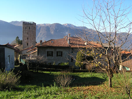 Fra le case svetta l'alta e squadrata Torre del Barbarossa, potente costruzione della famiglia Mandelli, presso la quale, nel 1158, trovò ospitalità l'imperatore. All'epoca tutto il territorio era in grande fermento d'armi, causa la guerra dei dieci anni fra Como e Milano scatenata per la nomina del Vescovo di Como e per il controllo del contado di Lecco. Mandello era schierata con Como e con l'Imperatore il quale, durante la sua visita al territorio, nominò feudatario del borgo, Alcherio Bertola, che quattro anni più tardi diverrà Duca di Mandello.