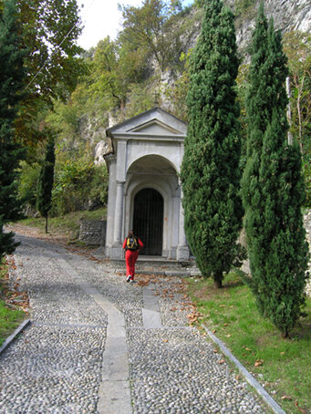 Si prosegue la discesa sullo sconnesso sentierino, che ora perde quota con numerosi tornanti, e si giunge ad un cartello esplicativo del "Percorso dei Massi Erratici" che illustra il panorama e l'ambiente del paesaggio pedemontano. La discesa continua sempre piuttosto ripida fino ad una spalla erbosa dove sulla destra si diparte un altro sentiero verso il Corno Birone. Poco più a valle il sentiero percorre la dorsale proprio sulla verticale della chiesa della Madonna di San Martino, scende un prato dove si trova la baracchetta di un roccolo e poi piega a destra (una diramazione, inizialmente invitante, sulla sinistra porta ad un tratto esposto ed insidioso e poi ad una recinzione) per aggirare uno sperone roccioso poco a valle del quale si giunge sulla rampa acciottolata che porta alla chiesa della Madonna di San Martino.