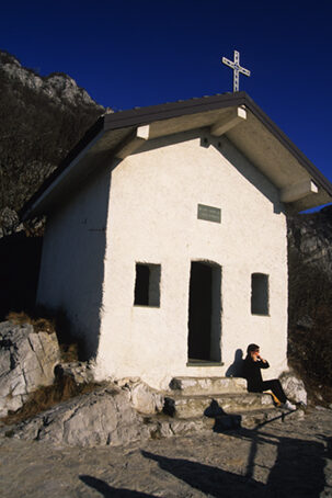 Tornati alla bocchetta s'inizia a perdere quota affacciandosi sul Lario. Con belle visuali sulle grandi pareti occidentali del San Martino e sulla Val Verde si compie un lungo diagonale per poi iniziare una serie di tornanti che entra nel bosco. Lambito un baitello di pietra, si prosegue la discesa nel bosco sempre più rigoglioso fino a giungere al Rifugio Piazza e alla chiesetta del San Martino.