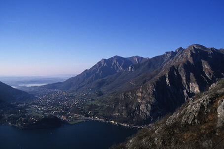 Il punto angolare di questa formazione geologica è dato da un gran crestone che scende in direzione Sud-ovest originandosi dalla vetta del Monte Coltignone 1474 m. La dorsale si eleva con alcune vette secondarie di cui quella inferiore è il Monte San Martino. Da qui, verso oriente, si allunga un ripido versante secondario tutto valloncelli e gole da cui sporgono bianchi torrioni rocciosi, che trova il suo pilastro di sostegno nell'alta parete della Corna di Medale. Questa larga facciata calcarea, alta circa 400 metri, domina a sua volta l'accesso alla Valsassina, sovrastando le frazioni di Rancio, Malvedo e Laorca. La gita che consigliamo non è delle più lunghe ma richiede buona "gamba" poiché si svolge lungo ripidi sentieri ben gradinati, prima, e poi su tracciati più stretti e a volte un po' esposti come per esempio il tratto che collega ia Medale alla Baita Falco. Il percorso ad anello si snoda lungo le pendici meridionali e occidentali del San Martino offrendo così meravigliosi scorci sia sul ramo di Lecco del Lario, sia sulla cittadina stessa, sull'Adda e sull'ampia sella di Valmadrera chiusa fra il Monte Barro, a Sud, e il Moregallo a Sud-ovest.