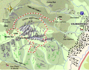 a) proseguire la salita portandosi sulla cresta ala Bocchetta di San Miro e poi volgere a sinistra sull'ampia dorsale boscosa raggiungendo in breve la vetta del Monte Rai. Da qui, seguendo le indicazioni prendere il sentiero n° 3 che s'abbassa per cresta verso Est. Tralasciando la deviazione a destra per San Pietro in Monte si raggiunge una spalletta rocciosa dove, da sinistra, giunge la variante seguente.