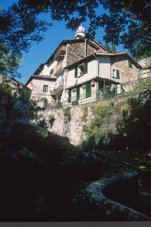 Percorse alcune scalette immerse nel verde si giunge ad una lunga passerella che lambisce le opere di captazione idrica che convogliano le acque del Pioverna. Al termine della passerella protetta da una bella ringhiera in stile vagamente Liberty, si entra nell'Orrido la cui gola é anticipata da una grandiosa marmitta dei giganti. Parte dei manufatti qui presenti, la torretta che reca ancora visibili alcuni sbiaditi affreschi ed i giardini posti allo sbocco del Pioverna, sono ciò che resta delle opere promosse dalla locale famiglia Denti di Bellano, nei secoli XVI° e XVII°, era proprietaria delle fucine per la lavorazione del ferro estratto in Valsassina.