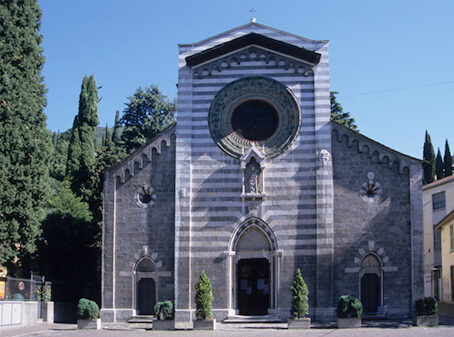 Usciti dal'Orrido a... "riveder le stelle", possiamo ora dedicarci ad una breve visita di Bellano. Tornati nella Piazza San Giorgio ci troviamo al cospetto della chiesa dei Santi Nazaro, Celso e Giorgio, splendido edifico sacro risalente alla metà del XIV secolo e mirabile esempio di gotico lombardo. La bella facciata si presenta armoniosamente divisa in tre scomparti di cui quello centrale, monocuspidato, è il principale. La facciata di quest'ultimo elemento e realizzata con fasce alternate di pietra nera di Varenna e bianca di Musso. Il portale principale, a sesto acuto, è sovrastato da un'edicola con la statua di Sant'Ambrogio, la cui cuspide si insinua nello splendido rosone di terracotta smaltata verde.