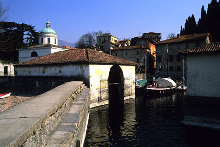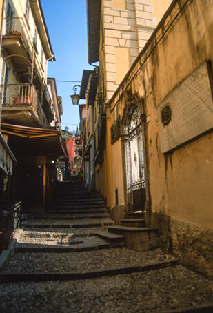 Lasciata l'auto in uno dei tanti parcheggi che precedono il porticciolo, si segue il Lungolago A. Manzoni fino al passaggio coperto che immette nella piazza del porto. Era, questa, la prima delle tre porte che in epoca medioevale consentivano di valicare le mura difensive del paesello. Prima del passaggio, sulla destra, si diparte la "Salita Serbelloni" che gli abitanti chiamano ancor oggi "il Fossato" poiché un tempo, al suo posto, correva il fossato del sistema difensivo medioevale. Poco dopo l'imbocco della salita, sulla destra, una grande lapide ricorda il soggiorno a Bellagio di Franz Liszt. Fra negozietti di souvenir e di prodotti artigianali locali, la scalinata sbuca in Via Garibaldi che, verso destra, porta alla chiesa di San Giacomo. La chiesa, edificata nel XII secolo, ha pianta rettangolare divisa in tre navate. Di aspetto massiccio e severo l'edificio ha subìto diversi rimaneggiamenti che ne hanno modificato moltissimo l'originaria architettura. L'annessa torre campanaria fu eretta sulle fondamenta di una preesistente torre di guardia. All'interno sono conservati un pregevole dipinto della scuola del Perugino, un magnifico altare ligneo, un crocefisso arcaico del XII secolo e un elegante ambone in "marmo di Musso". Dal sagrato della chiesa si può scendere lungo Via Roma, che riporta al porticciolo. Poco dopo aver imboccato la via si può proseguire a destra in Via Vitali che, con piacevole passeggiata, percorre in alto il promontorio di Bellagio, raggiungendo la panoramica postazione di Punta Spartivento da dove si può ammirare l'ampio e luminoso bacino dell'alto Lario coronato dai monti. Una volta tornati in paese consigliamo di "giocare" un po' perdendoVi nelle numerose viuzze in salita che ne percorrono il cuore. Nei numerosi negozietti, potrete acquistare i tipici prodotti dell'artigianato locale, i "vetri di Bellagio" o le belle ceramiche.
