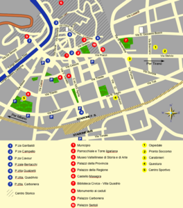 Da Piazza Quadrivio si può imboccare sulla sinistra la Via Scarpatetti il cui nome ricorda quello di un'antica famiglia grigione e che probabilmente deriva dal dialettale sgarba tecc" scoperchia tetti. Poco dopo l'imbocco, la via passa sotto una volta e inizia a salire dolcemente attraversando il cuore del centro storico di Sondrio. Una passeggiata fra gli antichi palazzi e le piazzette, fra l'intrico di viuzze e scalinate di quest'angolo di città, è senza dubbio consigliabile. Con un percorso piacevolissimo la strada sale fino ai piedi del Castello Masegra, da dove si gode un completo panorama sulla città. Il castello risale probabilmente al 1041, ma ha subito numerosi ampliamenti e rimaneggiamenti che lo hanno portato ad assumere le forme e le dimensioni attuali. Sempre da Piazza Quadrivio è possibile imboccare a destra Via Maurizio Quadrio. La via si apre sui Giardini Sassi, oltre i quali svetta la torre campanaria della chiesa collegiata dei SS. Gervasio e Protasio. Di fronte ai giardini, nel Palazzo Sassi ha sede il Museo Valtellinese di Storia e Arte, che ospita la più importante e completa collezione di reperti storici ed artistici di tutta la provincia. Fra l'altro, nel museo sono conservate due eccezionali lapidi incise con un alfabeto di tipo nord-etrusco che ha preso il nome di alfabeto di Sondrio". La pinacoteca conserva importanti opere di artisti valtellinesi e non, fra cui quadri di Pietro Ligari il più celebre pittore locale. Prendendo di mira l'imponente sagoma della torre campanaria si è presto in Piazza Campello dove si trova la chiesa parrocchiale dedicata ai SS. Gervasio e Protasio. La chiesa originaria, forse anteriore al XII secolo, fu abbattuta per lasciar posto ad un più grande edificio disegnato da Pietro Ligari. Purtroppo la mancanza di fondi, la pretesa di voler costruire contemporaneamente il campanile e le numerose incomprensioni fra architetto ed esecutore delle opere, non permisero di completare l'originario progetto. Ne è uscito un edificio nel complesso pesante e triste, che male rispecchia le eleganti idee ligariane. All'interno sono conservate alcune importanti tele dello stesso Ligari. Di fronte sorge il Palazzo del Municipio risalente al XVI secolo. Da Piazza Campello si può imboccare verso Sud il Corso XV Aprile, che in breve ci porta sotto le possenti, grigie mura del Palazzo della Provincia e del Governo (1932-1935), opera dell'architetto Giovanni Muzio. Nelle intenzioni, peraltro riuscite, del progettista il palazzo avrebbe dovuto essere una sorta di simbolica rappresentazione dell'arte storica valtellinese ed è stato realizzato con l'impiego dei più comuni, e nello stesso tempo pregevoli, materiali edili provenienti dalla valle: il granito serizzo per le coperture esterne, il serpentino, il legno, quest'ultimo usato nei rivestimenti interni. La grande sala del Consiglio è affrescata con sei encausti di Gianfilippo Usellini, raffiguranti scene delle attività tradizionali valtellinese cui si uniscono immagini di modernità come quelle della centrale idroelettrica. La realizzazione del Palazzo Muzio" comportò anche una piccola rivoluzione nell'assetto urbanistico cittadino con l'apertura dell'attuale Corso XXV Aprile, corsia di congiunzione fra Piazza Campello e Piazzale Bertacchi. L'opera appena realizzata fu scelta come soggetto di un acquerello realizzato in quegli anni dal celebre grafico Marcello Dudovich, uno dei più grandi disegnatori di pubblicità e poster del XX secolo.