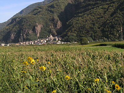 Con qualche serpentina la pista si porta all'altezza della rupe del versante retico valtellinese sulla quale sorge ben visibile l'antico Santuario della Madonna della Sassella.