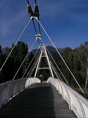 Sottopassato il ponte stradale sull'Adda in località Porto di Albosaggia procediamo ancora per poche centinaia d metri giungendo alla bellissima ed elegante passerella che consente l'attraversamento del fiume. Sulla sponda opposta continuiamo verso Ovest lambendo un chiosco e delle recinzioni. Questo settore è sempre molto affollato da famigliole, podisti, ciclisti e...pensatori; pertanto vi raccomandiamo di limitare la velocità e di avere pazienza. Un campanello sulla bicicletta è un ottimo strumento per annunciarsi.