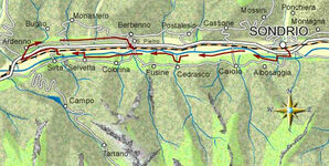 Passati sotto il ponte della strada che unisce la SS38 con il paese di Caiolo, si procede in un alternarsi di vasti prati e piccole zone di selva; si supera il recinto di un allevamento di struzzi e poi la superficie ben tenuta di un campo da golf. Ci troviamo nell'area dell'Avio superficie valtellinese, piccolo aeroporto usato da molti appassionati del volo a vela. Poco più avanti tocchiamo le rive di un affluente dell'Adda e siamo costretti a deviare a sinistra per risalirne l'argine fino al ponte della Strada Pedemontana orobica che ne consente l'attraversamento. Oltre il ponte scendiamo a destra, tornando sul grande fiume per percorrere una zona di vasti campi. Procediamo per circa 1800 metri passando sotto un ennesimo ponte oltre il quale una breve deviazione ci porta sulla Pedemontana orobica all'ingresso del ponte ad arco gettato sul torrente Madrasco, Superato il ponte si torna a destra sul Sentiero Valtellina e lo si percorre per circa 3,6 km finché si giunge sull'argine dell'invaso artificiale di Ardenno ove si consiglia di uscire a sinistra sulla Pedemontana orobica (tratto di Sentiero Valtellina ancora da realizzare). Fatti circa 500 metri si tocca il paese di Selvetta dove si devia a destra traversando l'Adda su un ponte al cui termine si piega a sinistra per pedalare lungo la strada asfaltata che lambisce l'argine dell'invaso sulla destra. Dopo circa 2 k si intercetta la strada che dalla SS38 porta a Sirta, si piega a destra fino al passaggio a livello e prima di esso a sinistra, costeggiando la ferrovia e vasti prati fino alla stazione ferroviaria di Ardenno-Masino. Qui un sottopassaggio permette di traversare in sicurezza la SS38 e di imboccare il lungo rettilineo che porta ad Ardenno. Giunti nell'ampio quadrivio all'ingresso del borgo, prendiamo a destra ed iniziamo il rientro lungo la Strada Pedemontana retica. Generalmente poco trafficato, il percorso traversa, con alcuni saliscendi e qualche serpentina, tutti i paesi posti alle pendici del versante retico valtellinese, in buona parte coltivato a vigneto. Dopo 7 km e 500 metri circa si giunge ad una grande rotonda posta poco prima dell'ingresso di San Pietro Berbenno, prendendo a destra si traversa la SS38 su un viadotto e poco dopo si supera l'Adda su un ponte. Un centinaio di metri dopo si devia a destra lungo la Pedemontana orobica giungendo al ponte ad arco gettato sul torrente Madrasco ove ci si ricollega all'itinerario di andata.