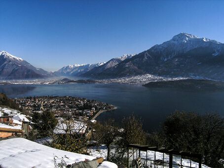 L'abitato sorge su una sella, protetto verso il lago da un promontorio da dove si può ammirare un panorama vastissimo. Verso Nord-est colpisce subito il grandioso imbocco della Valtellina, incorniciato fra la mestola piramide del Monte Legnone a destra e le robuste pendici del Monte Bassetta a sinistra. Evidente è il rettilineo corso dell'Adda prima di immettersi nel lago. Sotto, lungo la costa lariana appare invece la lingua di terra dove sorge l'abitato di Domaso.