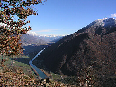 Tornati alla strada principale procediamo salendo con qualche tornante per raggiungere le case della "costiera di Santa Croce" affacciata coi suoi piccoli agglomerati di case in pietra sulla Valtellina e su Morbegno. Un reticolo di sentieri e mulattiere usate per collegare le varie contrade e per la coltivazione dei vigneti permettono varie brevi escursioni. La strada punta ora decisamente in direzione Est, alla volta della tondeggiante emergenza del Culmine di Dazio (o Colma di Dazio) che, come una imponente chiusa sbarra l'accesso alla media Valtellina.