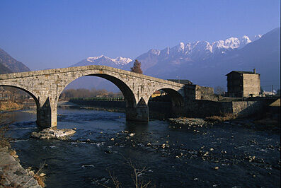 Ma procediamo con ordine, o meglio, cerchiamo di farlo. Per raggiungere le località descritte si deve abbandonare la SS 38 all'altezza di Morbegno e, seguendo le indicazioni per Traona-Mello-Dazio, raggiungere il moderno ponte sull'Adda che permette di portarsi sul versante pedemontano retico della Valtellina. Varcato il ponte prendete a destra e appena prima del primo tornante parcheggiate. Traversate la strada e scendete per una stretta carrozzabile verso destra. In breve raggiungerete la contrada di Ponte Ganda il suo magnifico ponte medioevale. Originariamente edificato nel '400 il ponte ha subito numerosi rimaneggiamenti e restauri a causa dei danni subiti dalle piene dell'Adda e per cause belliche. L'attuale manufatto risale all'ultimo rifacimento operato dall'architetto milanese Francesco Bernardino Ferrari nel 1778. Con la sua grande arcata centrale e i suoi imponenti pilastri di sostegno il ponte costituisce senza dubbio un notevole motivo di curiosità. Per secoli fu uno dei pochi ponti in muratura sull'Adda e conobbe particolare importanza nel '500 allorché fu aperta la via "Priula" che, attraverso il Passo S. Marco collegava la bergamasca e quindi la Signoria di Venezia con la Valtellina e i territori allora occupati dai Grigioni.