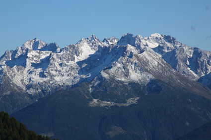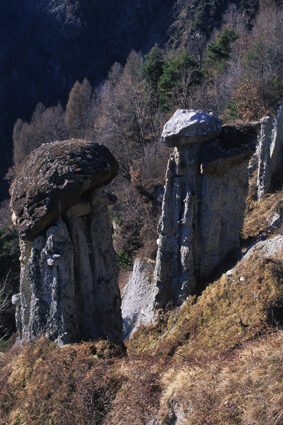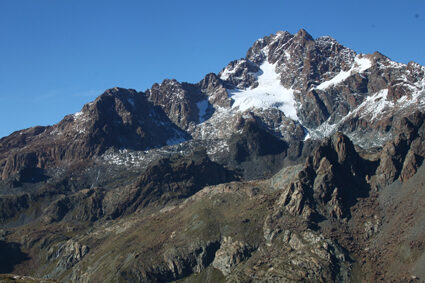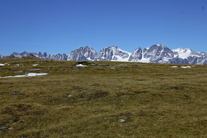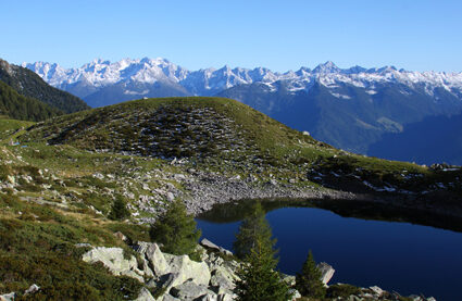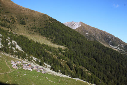 A Postalesio, lasciando a destra una diramazione che verso destra porta a Castione e dalla quale faremo ritorno, si prosegue fra le case portandosi a monte di esse. Il percorso prosegue con vedute sempre più aperte sul fondovalle e, con stretti tornanti, s'innalza fra boschi di latifoglie, per giungere infine al vasto parcheggio della "Riserva Naturale delle Piramidi di Postalesio" tutelata con delibera regionale del 1984. Avendo tempo e voglia è possibile fare una breve visita a questo piccolo monumento naturale per poi riprendere la pedalata verso l'alto. Poco più avanti, si giunge sul bel poggio erboso dove sorgono le case di Pra Lone 1002 m dal quale si gode uno splendido panorama. Rientrata nel bosco, la carrozzabile prosegue con qualche tornante e un facile tratto sterrato, per poi riprendere su asfalto fin verso i 1700 m di quota. Ora nuovamente sterrata, la strada prende quota con qualche altro tornante e poi inizia ad entrare lentamente verso la testata della Valle del Bocco. Con un lungo diagonale in un bel bosco di abeti, si traversano alcune di vallecole ed infine si giunge al margine inferiore dei pascoli dell'Alpe Colina 1947 m. Lasciando a destra la deviazione che porta al grosso nucleo di baite dell'alpeggio, si continua sulla bella sterrata che prende quota verso sinistra per poi riportarsi a monte delle baite con un ampio tornante ed arrivare su un panoramico spalto erboso nei pressi di uno stallone verso quota 2021 m. A questo punto vi consigliamo una breve deviazione non indicata nella traccia GPS allegata. Prendete la stradina inerbita che passa appena alle spalle dello stallone che, quasi in piano, porta in breve sulla sponda settentrionale del piccolo Lago di Colina 2076 m, preziosa risorsa idrica per tutto il vasto alpeggio. La stradina prosegue ancora innalzandosi con alcuni tornanti per terminare presso un piccolo edificio a quota 2230 m circa. Qui si lasciano le biciclette e si sale il ripido pendio erboso sovrastante per tracce arrivando ben presto ad intercettare un sentiero che in diagonale sale verso destra arrivando ad una depressione sul crinale fra il Sasso Bianco ad Est ed il Monte Caldenno a Ovest. Il grandioso panorama che si aprirà ai vostri occhi vale da solo la fatica fatta fin qui: a Nord-ovest s'impone la mole del Monte Disgrazia, mentre verso Nord, più lontano, appare tutta la sfilata di cime del massiccio del Bernina (calcolare almeno un'ora e mezza fra andata e ritorno).