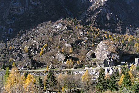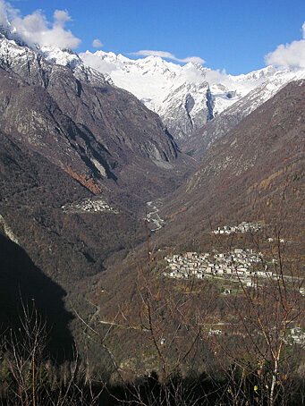 La strada, assai larga, sale con gradualità percorrendo la sinistra orografica dell'imbocco della valle qui assai angusto; nulla fa presagire lo spettacolo che si aprirà più in alto. Oltrepassata la centrale idroelettrica di Ardenno-Masino la carrozzabile prende quota con quattro ampi tornanti e poi entra decisamente nella valle. Lasciata sulla destra la deviazione per Biolo-Piazzalunga, si prosegue con pendenza moderata e qualche breve tratto in lieve discesa finché dopo 2 km si raggiunge la località Ponte del Baffo 571 m, ove, se si traversa il Masino verso sinistra si può salire a Cevo e poi giungere a Caspano sulla Costiera dei Cech. Dal Ponte del Baffo la salita riprende graduale e dopo circa 700 metri si incontra il primo di due eleganti doppi tornanti. Traversato il Masino si procede sula sponda opposta e ben presto si giunge alle porte del più importante abitato della valle, Cataeggio 799 m, che ormai è un tutt'uno con il successivo nucleo di Filorera. All'uscita di Filorera si giunge ad un bivio con fontanella in corrispondenza del quale si deve piegare a sinistra (a destra Valle di Sasso Bisolo) e, aggirando un enorme masso erratico, si entra nella vasta piana che ospita il Sasso Remenno, il più grande monolite d'Europa con le su pareti alte fino a 50 metri. Il percorso ora è pianeggiante e, dominati dalle selvagge vette granitiche del Masino, lambiamo, aggirandolo, il grandioso masso con una breve salita che porta ad un nuovo tratto pianeggiante che nel verde ci deposita a San Marino Val Masino (918 m - 13 km da Ardenno), punto in cui la valle si ramifica. Seguendo la strada si traversa il piccolo villaggio con 4 tornanti (al seconto tornante bivio per Val di Mello) entrando decisamente nella oscura e selvaggia Valle dei Bagni sovrastata da enormi pareti e strutture granitiche solcate da cascate spumeggianti. Lambito un campeggio si prosegue sulla sinistra orografica della valle e dopo aver preso quota con alcuni tornati si traversa il torrente portandosi sulla sponda opposta. Altri due tornanti e un lungo tratto di salita a mezza costa portano presso l'antico Albergo Belvedere (oggi abbandonato) e alle soglie della splendida Foresta dei Bagni Masino oggi tutelata da ERSAF (Ente Regionale Servizi Agricoltura e Foreste). In tardo autunno quando i faggi si vestono dei colori autunnali lo spettacolo è indimenticabile, ma anche con il verde intenso della rinascita primaverile il tratto di strada che termina nel piazzale delle Terme dei bagni Masino 1172 m, è di grande suggestione, da non perdere.