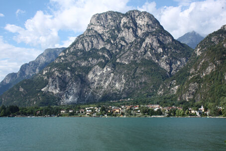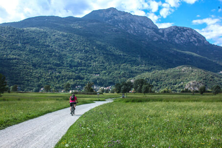 Interessante gita alla portata di tutti, priva di dislivelli o difficoltà di sorta. Richiede solo un minimo di attenzione nel breve tratto che si svolge sul ponte della SS36 dello Spluga e nel successivo attraversamento della strada per immettersi nella ciclabile che poi percorre il vasto Piano di Spagna. Numerosi sono i motivi di interesse lungo questo percorso che offre un paesaggio mutevole passando dalle sponde del Lario per traversare su stradine sterrate la pianura alluvionale oggi un gran parte occupata da terreni coltivati e da aree paludose che costituiscono la Riserva naturalistica del Piano di Spagna. Entrati in Valchiavenna il paesaggio muta nuovamente e al cospetto di altre rupi si costeggia il Lago di Mezzola, un tempo parte integrante del Lario e poi da esso separatosi a causa del costante apporto di materiale alluvionale da parte della Mera.