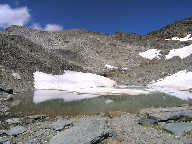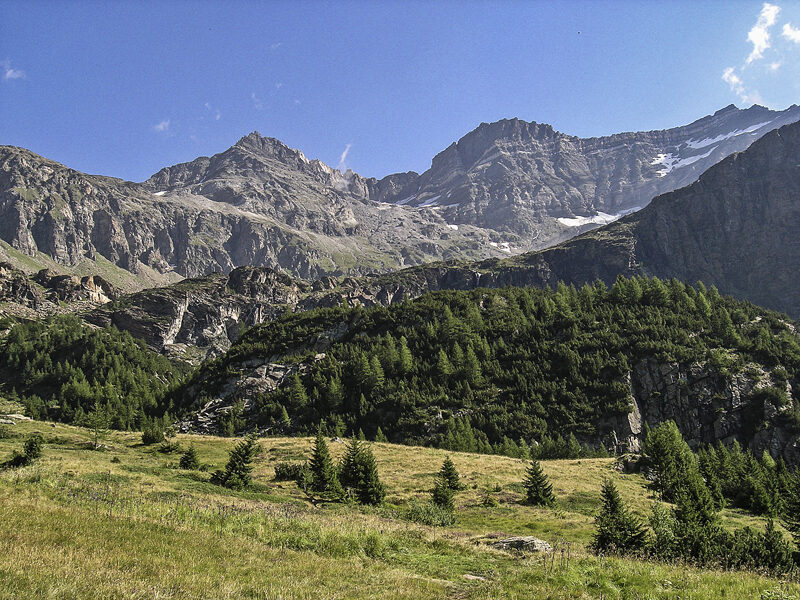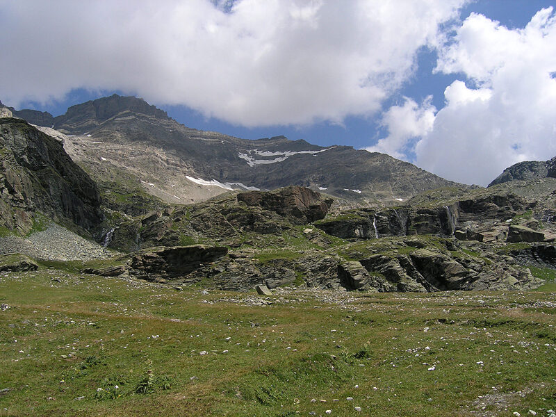Nella zonadell'Alpe Fora si esce dalla fascia rocciosa degli "gneiss diChiareggio" e si percorre grosso modo il limite fra le rocce micascistosedella Falda Margna e le solite serpentine della Falda Suretta. Il punto dicontatto si innalza gradatamente a mezza costa dai pendii meridionali delgruppo delle Tre Mogge fino alla Forcella d'Entova ed è assai ben visibile perchéha dato origine ad un fenomeno di erosione differenziale, che ha creato unaserie di gradini dai quali le acque provenienti dai piccoli ghiacciai e nevaisovrastanti, scendono con belle cascate. La piana che costituisce la partesuperiore del pascolo dell'Alpe Fora è un antico fondovalle, poi parzialmenteeroso, che proseguiva verso oriente passando sotto le pendici meridionali delSasso Nero. Nella zona del Passo delle Tre Mogge, e più precisamente al piededella cresta Sud-ovest del Pizzo delle Tre Mogge dove passa il nostro percorso,sono reperibili interessanti minerali: ricordiamo i granati rossi, presenti inbelle cristallizzazioni, la thulite, minerale di manganese, generalmente inaggregati microcristallini rosati, la vesuvianite e la clinozoisite. Nellostesso luogo sono stati rinvenuti campioni di serpentino nobile, minerale ancorapoco studiato, suscettibile di lavorazione come pietra semi preziosa. Si trattadi una varietà di serpentino dall'aspetto assai più compatto e caratterizzatada un caratteristico colore verde più o meno intenso.