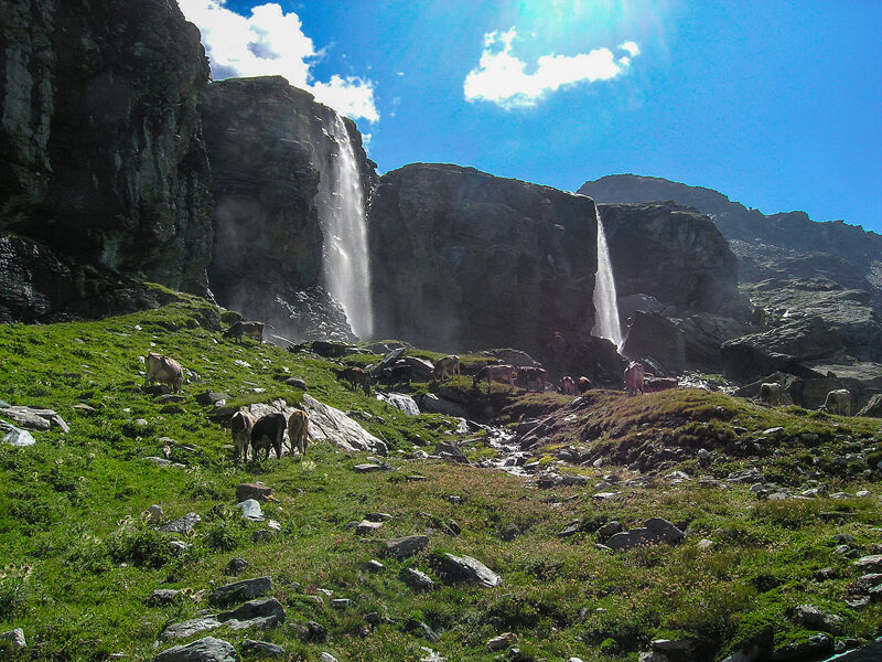 Da Chiareggio 1612 m si imbocca il sentiero dell'Alta Via della ValMalenco (segnalazioni a triangoli gialli) che si stacca sulla destra all'ingresso del paese (segnalazioni anche per Alpe Fora e Rifugio Longoni). Passando per Costi 1638m, il tracciato devia poi a destra e dopo aver attraversato il vallone delNevasco inizia una lunga traversata a mezza costa nel bosco per entrare infinenella Val Fora, Risalendo la valle si giunge ad intercettare una stradasterrata che proviene da sinistra, dalle vicine cave di Serpentino, Seguendo iltracciato o tagliando qualche tornante, per prati aperti si giunge a lambire ilpiccolo nucleo di baite dell'Alpe Fora inferiore 2053 m (ore 1). Deviandoleggermente a destra si prosegue la ripida salita e poi grazie ad alcunitornanti si prende quota finché è possibile traversare un torrentello percontinuare alla sua destra. La salita termina al raggiungimento delpianeggiante gradino superiore della Val Fora verso i 2300 m. Seguendo leabbondanti segnalazioni si traversano le praterie in direzione Nord-est fino adun cartello escursionistico che indica sulla destra il proseguimento per ilrifugio Longoni e sulla sinistra la deviazione per il Passo delle Tre Mogge.Deviando verso Nord si segue quest'ultima indicazione che ci fa percorrere ipianeggianti pascoli verso il margine sinistro della prima delle due falesiesovrapposte che chiudono l'altopiano. Aggirata a sinistra la barriera rocciosasi piega poi a destra percorrendo lo spalto verdeggiante che separa le duefalesie e poco prima delle due meravigliose cascate gemelle che precipitanodalle pareti si devia a sinistra risalendo un breve pendio che porta sotto unaliscia parete alla cui base, deviando a destra il tracciato, ora un po' incertoe mal segnato, si porta sui magri pascoli sovrastanti. Puntando verso Nord(qualche ometto) su terreno sempre più sassoso si giunge ad incrociare ilsentiero, o meglio la traccia che qui giunge da destra, dal Rifugio Longoni.Piegando a sinistra ci si porta alla base dei ripidissimi pendii che difendonol'accesso al valico e grazie ad un canalone detritico (neve) si supera sulladestra la bastionata rocciosa che dalla Sassa di Fora si allunga fin qui. Simette così piede sulla Cengia del Caval, larga rampa detritica compresa fra labastionata e la base dello sperone. Con ripida salita su traccia di sentieroverso Nord-ovest si segue questo spalto fino alla conca morenica occupata da unlaghetto di fusione, lambite le sponde verso sinistra si guadagna un breve filomorenico e con un'ultima deviazione a destra, su terreno detritico e a volteinstabile si giunge al passo.