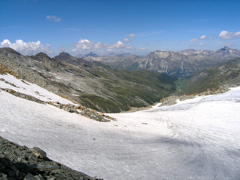 Dopo ilPasso del Muretto, il Passo delle Tre Mogge (Pass dal Tremoggia sulla cartasvizzera, CNS), è il miglior punto di transito fra Val Malenco e Alta Engadina.Situato sulla larga sella della cresta spartiacque e di confine, alla basedella cresta Sud-ovest del Pizzo delle Tre Mogge, il valico presenta a Sud unaconca morenica sostenuta da una bastionata di rocce che piomba sul circoterminale della Val Fora; a Nord è raggiunto dal ramo occidentale del Vadretdal Tremoggia. Con ogni probabilità un tempo ebbe maggiore frequentazione delvicino Passo del Muretto, soprattutto per la linearità di collegamento chepermette fra i due versanti. Lo sviluppo e l'accrescersi del ghiacciaio sulversante Nord ha poi fatto preferire passaggi più a bassa quota. Si ha notiziadi una antica mulattiera che da San Giuseppe portava all'Alpe Entova e di quiproseguiva fino al Passo delle Tre Mogge. Sul versante elvetico si attraversavauna vedretta che adduceva ai pascoli della Valle di Fex. All'inizio del 1600tale via doveva essere ancora frequentata, se viene citata al posto di quelladel Muretto dal segretario Padavino nella sua relazione sulla Valtellina:"item nota che da Selva piano (l'odierna Silvaplana) si può per la Valledi Malenco andare a Sondrio passando il monte Mallencasco et una vedretta longacirca un miglio dove perpetuamente è ghiaccio et difficilissimo percavalli". Sotto il passo, sulla cosiddetta Cengia del Cavallo, furonorinvenuti alcuni ferri di cavalcature e più in basso fino agli inizi dell'800erano visibili tratti di selciata. Nei documenti la strada è chiamata di Silletteo di Sellette e come già detto fu abbandonata per l'aumento dei ghiacciai,verificatosi a partire dal 1450, cosa che rese impraticabile il percorsousuale. Allora il passaggio delle carovane si concentrò sul Passo del Murettoche sebbene meno lineare, era divenuto più agevole per la sua minorealtitudine. A conferma della naturale evidenza del passaggio delle Tre Mogge,ricordiamo che ancora nel 1905 fu redatto il progetto di una ferrovia a cremaglierache, partendo da Sondrio, avrebbe dovuto collegarsi alla rete ferroviariasvizzera a Saint Moritz. L'attraversamento dello spartiacque alpino eraprevisto con un lungo tunnel passante poco ad occidente del Passo delle TreMogge, con entrata a monte dell'Alpe Fora e uscita alla base del ghiacciaio diFex.