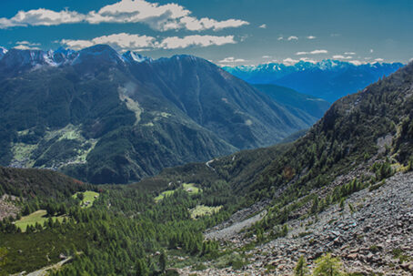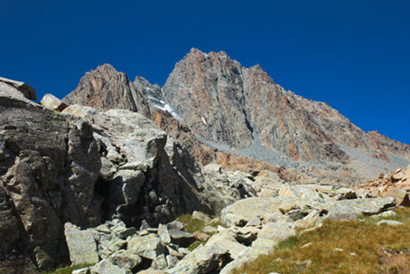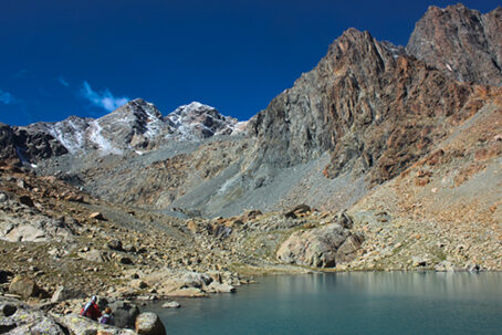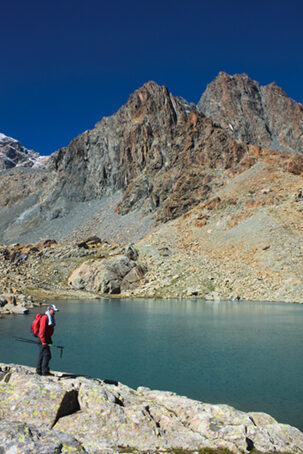 Seguendo le indicazioni per l'Alpe Pradaccio ed il Passo Ventina, si traversa su un ponticello il Torrente Secchione e si sale all'Alpe Prato ove da destra giunge il largo sentiero proveniente da Primolo. Deviando a sinistra si prende quota lambendo la presa di un acquedotto e poco dopo si raggiunge l'Alpe Pradaccio. Da qui (indicazioni abbondanti) ci si porta alla base della ripida e desolata Val Sassersa. Dopo aver traversato quasi in piano un bosco di mughi, il sentiero prende a salire con notevole pendenza e stretti tornanti il lato destro (sinistra orografica) del vallone, sovrastato da pareti di serpentino striate di nero e intervallate da cenge di mughi. La ripidissima china porta ad un primo punto di respiro ove da sinistra (cartelli indicatori) giunge una variante dell'Alta Via che dall'Alpe Giumellino entra in Val Sassersa. La salita prosegue di nuovo ripidissima su ghiaioni di rosso serpentino e termina su un poggio da dove il percorso perde un po' di ripidezza (segnaletica ottima) e raggiunge finalmente le rocce montonate che delimitano ad Est la conca dei Laghetti di Sassersa. Sulla destra, dominato dalla rossa parete del Pizzo Rachele, il ghiaione prosegue ancora verso il vicino Passo Ventina che mette in collegamento con l'omonima valle e i rifugi Gerli-Porro e Ventina. Lambite verso sinistra le sponde del primo lago (2368 m), in ambiente desolato, ma molto suggestivo, si punta verso Sud-ovest al cospetto della gotica architettura della Punta del Lago, o Punta Maria, che si specchia nelle acque smeraldine e in breve si giunge al secondo e maggiore dei tre bacini. Poco sopra si trova il terzo laghetto e proprio sul cordone di detriti morenici che lo separa dal secondo lago, aggirandosi fra dune detritiche si trovano le gallerie di alcune antiche cave per l'estrazione di materiale contenente rame che pare fossero coltivate ancora nel XVIII secolo da maestranze bergamasche. La tradizione vuole che si estraesse oro ma più probabilmente si trattava solo di normalissima calcopirite, importante minerale di rame, il cui colore giallo dorato trasse in inganno gli abitanti locali che mai s'impegnarono negli scavi ma che erano forse un po' gelosi, sospettando di essere privati di tanta supposta ricchezza.