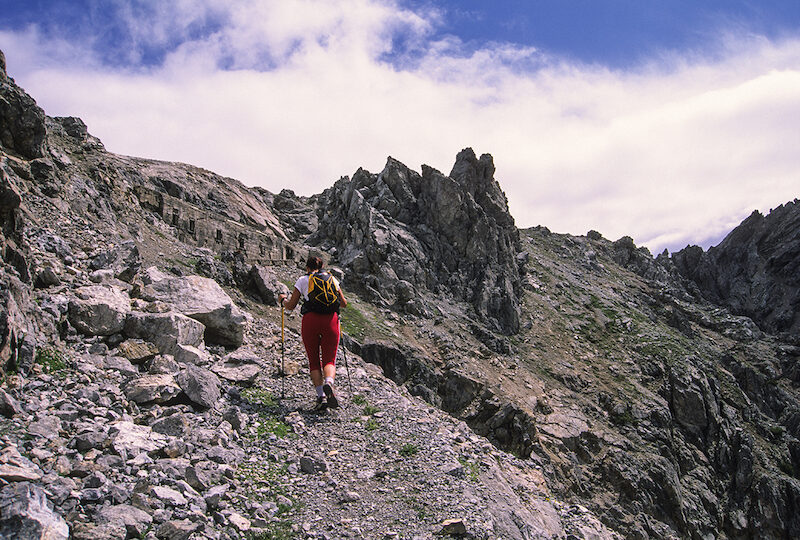 Poco sotto il crinale appare improvvisamente anche un incredibile edificio della cui presenza pochi sospetterebbero: è stato, infatti, costruito in un punto estremamente esposto e difficile. Il sentiero ci conduce all'ingresso di questa costruzione, un piccolo fortino facente parte del complesso di opere destinate a difendere l'accesso della Valtellina durante il conflitto 1915-1918. Qui terminava l'arditissima strada militare di cui oggi resta solo il primo tratto; uno sguardo verso il basso e sul cammino percorso ci può dare una vaga idea del lavoro che si rese necessario per compiere quest'opera incredibile. A questo punto si può: o entrare nel forte e percorrere una lunga galleria (meglio avere una pila, anche se non necessaria; possibilità di neve o ghiaccio sul fondo) che, con grande effetto scenografico, sbuca sul versante opposto aperto verso la Valle di Fraele e i suoi grandi bacini artificiali; o riprendere una debole traccia che, con percorso breve ma disagevole, porta sul filo di cresta.