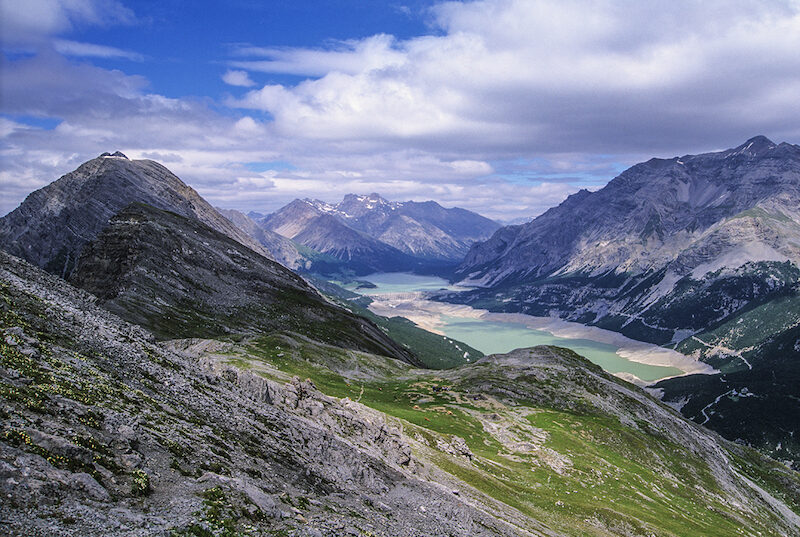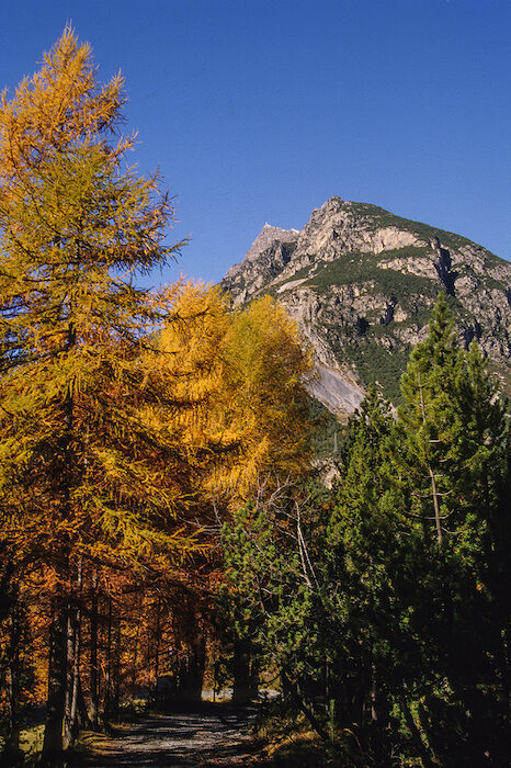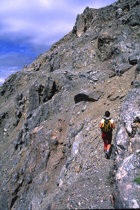 Come accennato si tratta di una vecchia strada militare che, con agevole percorso a tornanti tra i pini mughi, sale lungo il versante Ovest della montagna. Questo tratto, assai comodo, termina in corrispondenza di una grande spalla, da dove la morfologia della montagna muta radicalmente. Il bosco di mughi lascia improvvisamente il posto alle rupi e alle colate di detriti che da esse si sono staccate. Il passaggio è brusco, senza sfumature, così come pure improvviso è il cambio richiesto al nostro ritmo di marcia. Il largo tracciato termina, infatti, ai piedi delle rocce: divorato dal tempo e dalle frane, il suo posto viene preso da un sentierino che taglia al piede delle rocce passando su colate di sottili detriti calcarei. Qua e là si notano ancora tracce dell'antico percorso, ma sono le ultime. Con un paio di tornantini si raggiunge una spalla rocciosa da dove si apre un magnifico panorama sulla Valdidentro, panorama che si farà sempre più ampio e vertiginoso man mano che saliremo. Il sentiero taglia, ora, in diagonale lungo il versante meridionale del monte alternando tratti su terreno sicuro ad altri dove si cammina su una sottile ghiaietta che rende il passo un po' precario. Se volete ammirare ciò che Vi circonda consigliamo vivamente di trovare un punto possibilmente pianeggiante e di fermarVi. Stiamo attraversando un roccioso versante dove a speroni rocciosi s'alternano profondi canali di detriti che precipitano verso valle. La salita è emozionate e molto esposta, resa ancor più saporita" da alcuni passaggi in cui rocce sporgenti e sentiero stretto obbligano ad alcuni esercizi d'equilibrio. Con un lunghissimo diagonale siamo arrivati nel cuore del versante Sud del Monte delle Scale e, ora, alcuni tornanti ci permettono di guadagnare quota, mentre in alto è già visibile la cresta sommitale selvaggia e dentellata.