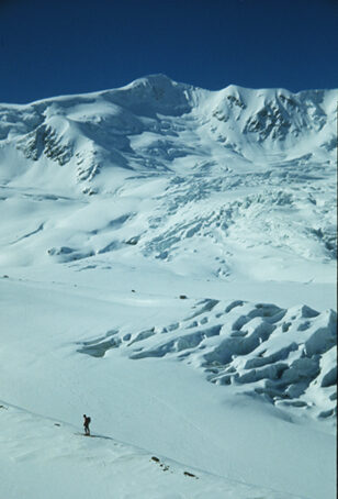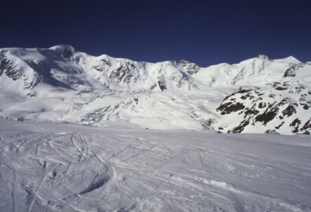 b) Dall'Albergo Ghiacciaio dei Forni scendere al laghetto artificiale presso cui si trova un altro piazzale parcheggio e con direzione Est risalire il fondovalle tenendosi sulla destra per poi tagliare in diagonale traversando il fondovalle per portarsi sulla sinistra della fronte del ghiacciaio. Salire un ripido avvallamento raggiungendo il filo della morena e procedendo in piano verso Sud mettere piede sul ghiacciaio (Dal rifugio Branca 2493 m scendere brevemente sul valloncello compreso fra la morena destra orografica del Ghiacciaio dei Forni e le pendici della montagna. Risalire portandosi da ultimo sul filo della morena fin quasi al suo termine per poi deviare a destra entrando sul ghiacciaio). Puntare in direzione Sud e, sopra l'affioramento morenico dell'Isola Persa 1742 m, piegare a destra passando alla base dell'affioramento roccioso 2897 m tagliando poi in piano verso Ovest fino a raggiungere i pendii glaciali che salgono verso la vetta e la dorsale fra il Tresero e la Cima San Giacomo. Con una ultima deviazione a sinistra si raggiunge la base della cresta sommitale fra la Punta Pedranzini 3599 m e la vetta, che in breve si raggiunge (vedi anche it. a).