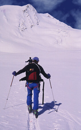 a) Dall'Albergo Ghiacciaio dei Forni scendere al laghetto artificiale presso cui si trova un altro piazzale parcheggio e con direzione Est risalire il fondovalle tenendosi sulla destra fino a portarsi ai piedi di un evidente canalone che scende da destra, il cui imbocco si trova quasi di fronte al Rifugio Branca (qui si può arrivare in discesa dal Rifugio Branca traversando la valle). Risalirlo fino ad arrivare sul ghiacciaio per poi piegare a destra raggiungendo il pendio nevoso che dal Pizzo Tresero si collega alla Cima di S. Giacomo. Deviare ora a sinistra e salire un ultimo ripido tratto fino sul crinale della cresta Sud-est. Lasciati gli sci per il facile filo di cresta si giunge in vetta.